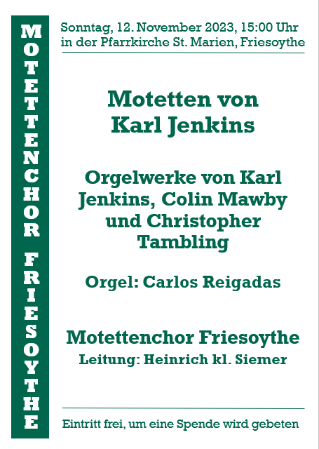 Ein etwas "kleineres" Konzert am 12.11.2023. Motetten von Jenkins und Orgelwerke (Organist Carlos Reigadas) zeitgenössischer Komponisten. Das Konzert war sehr gut besucht und schenkte ein helles Licht im dunklen November
