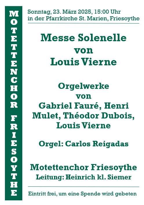 Wiederaufführung nach 23 Jahren: Messe Solenelle am 23. März 2025. Dieses eher unbekannte Stück des früheren Notre.Dame Organisten Louis Vierne ist selten zu hören. Carlos Reigadas, Organist der Kirchengemeinde, umrahmte die Messe mit Orgelwerken französischer Komponisten.
